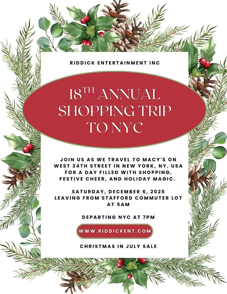 Welcome to the 18th Annual Holiday Shopping Trip to New York City! Join us on Saturday, December 6, 2025, for an exciting trip to New York City, offering a day filled with shopping, festive activities, and holiday charm. This self-guided tour provides an excellent opportunity to explore one of the world’s premier shopping destinations. Experience the beauty of holiday decorations, browse a wide range of stores, and immerse yourself in the seasonal atmosphere. Whether you’re searching for the perfect gift or treating yourself, this trip is designed to deliver a memorable and enjoyable experience. Your ticket includes a seat on a luxury coach, a shopping bag, continental breakfast, and refreshments. The bus will depart from Stafford Commuter Lot (Staffordboro Blvd location) across from Lowe's - exit 143B (Garrisonville Rd) 4:45 am - Buses will begin to board 5:00 am - Buses will depart from Commuter Lot The bus will stop at The Delaware House 10:00 am-10:30 am - Arrive to NYC - Macy's 34th Street The buses will depart from NYC - Macy's 34th Street 6:45 pm - Buses will begin to board 7:00 pm - Buses will depart from Macy's 34th Street The bus will stop at The Delaware House 12:30 am - The approximate time we will return to the commuter lot in Stafford, VA. Don't miss this exciting event - mark your calendars and get ready to shop 'til you drop in the heart of New York City. Please use your discount code - VABCC for a discount