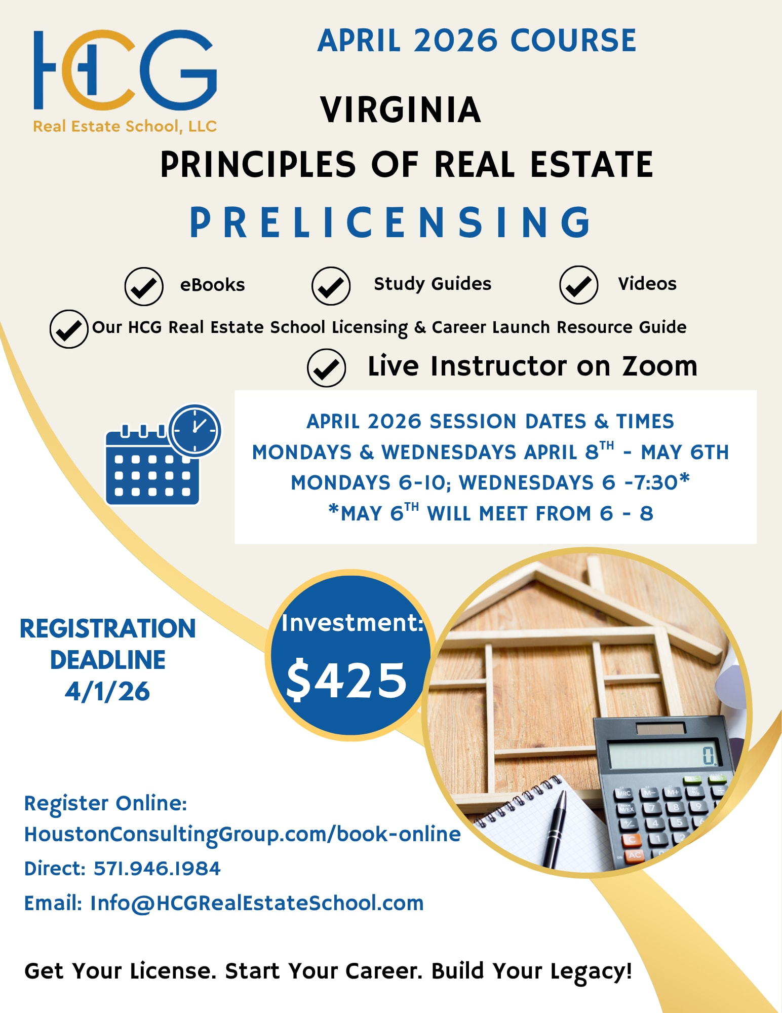 Jumpstart your Real Estate Career Today! Our "April 2026 Course" starting April 8th is open for registration! That's right, just 1 month in class and then you're ready to test for the exams to get your Virginia real estate license! The first step in starting your career in real estate for Virginia is obtaining a license. Our state-approved 60-hour (32-hour seat-time hybrid) Principles of Real Estate Course will equip you with everything you need to obtain your Virginia Real Estate license and launch the real estate career of your dreams! Session will be taught at night virtually on Zoom with a live instructor, Tara Houston. Attend from anywhere you are! Access the course schedule, details, registration and student reviews online at: April 2026 Course Check out testimonials and career learning videos at: Testimonials and Learning Videos