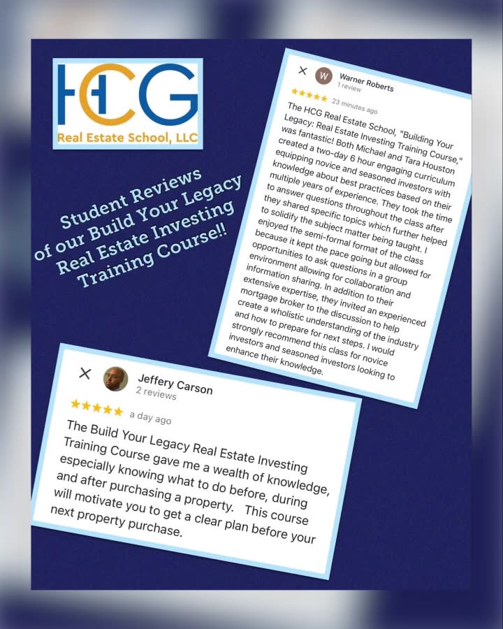 Are you ready to build the life and legacy of your dreams through real estate investing? This is YOUR time! Registration is open for our Build Your Legacy Real Estate Investing Training Course starting October 13, 2025 on Zoom with live instructors! Taught by experienced real estate investors, this 6-hour intense training course by HCG Real Estate School will empower you with the education, resources, support you need to acquire your first or next profitable investment property with confidence. Session dates and times: Monday, October 13th from 6-9 PM EST and Monday, October 20th from 6-9 PM EST. Listen to the success story of one of our first-time investor students at: StudentSuccessStory Course details on online registration link: BuildYourLegacyRealEstateInvestingTrainingCourse Deadline to register: October 6, 2025