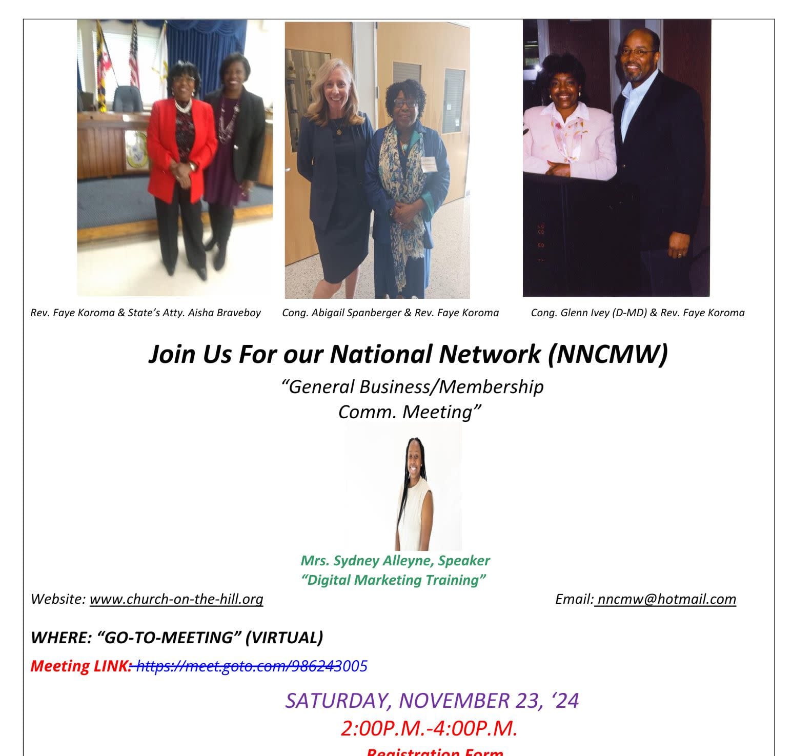 Remember to mark your calendar for our NNCMW General Business & Membership Comm. Meeting. We will discuss our NNCMW aggressive entrepreneurship Program. We will also discuss our 3 NNCMW Standing Committees: 1. Membership 2. Health 3. Special Events Ms. Sydney Alleyne will present on "Effective Social Media Marketing." Tickets are $25 ($30 on day of event)! Here is the Virtual "Go-to-Meeting" LINK: https://meet.goto.com/986243005 For more info., view our website at: www.church-on-the-hill.org. Send us an email at: churchonthehill.koroma@gmail.com. Call the Church office at: 571-669-4111.