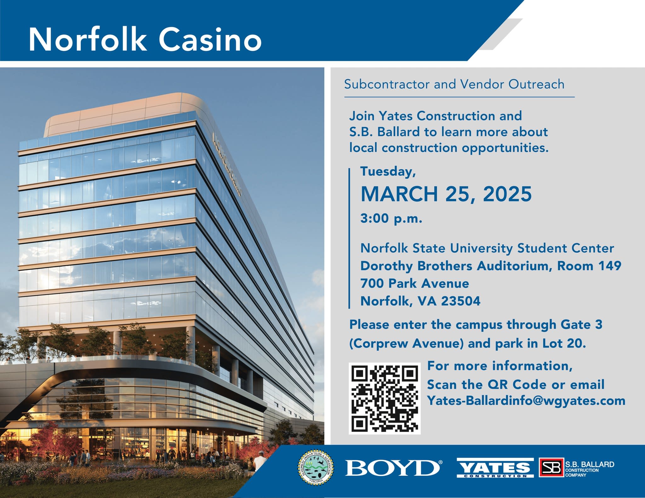 An exclusive contractor and vendor outreach event to learn more about local construction opportunities with the Norfolk casino project. This is your chance to connect collaborate and explore potential opportunities in the construction world. Please enter campus through Gate 3 (Corprew Avenue) and park in Lot 20. Free Event This is event is only 30 minutes. In person