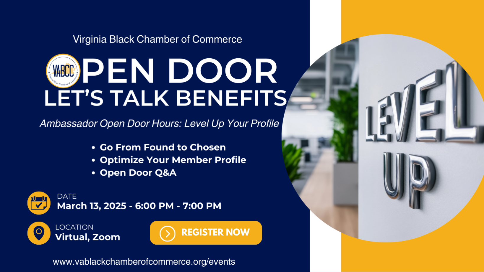 Virginia Black Chamber of Commerce Virtual Open Door 📣 Date & Time: March 13th, 6 PM - 7 PM Are you ready to stand out and take your business to the next level? Join us for the Virginia Black Chamber of Commerce Virtual Open Door — a valuable session designed to help you transition from being just "found" to being "chosen." 🔑 What’s in it for you? During this hour-long event, our amazing Chamber Ambassadors will be hosting open door hours. They’ll deliver hands-on guidance and answer all your burning questions in a live Q&A session. Whether you need advice on sharpening your profile, business strategy, or Chamber resources, our Ambassadors are here for you! Don’t miss this opportunity to connect, learn, and grow within the Virginia Black Chamber of Commerce community. ✨ Come for the knowledge, stay for the connections! Reserve your spot today and unlock your business potential. #VABCC #BusinessGrowth #ProfessionalDevelopment #MemberBenefits