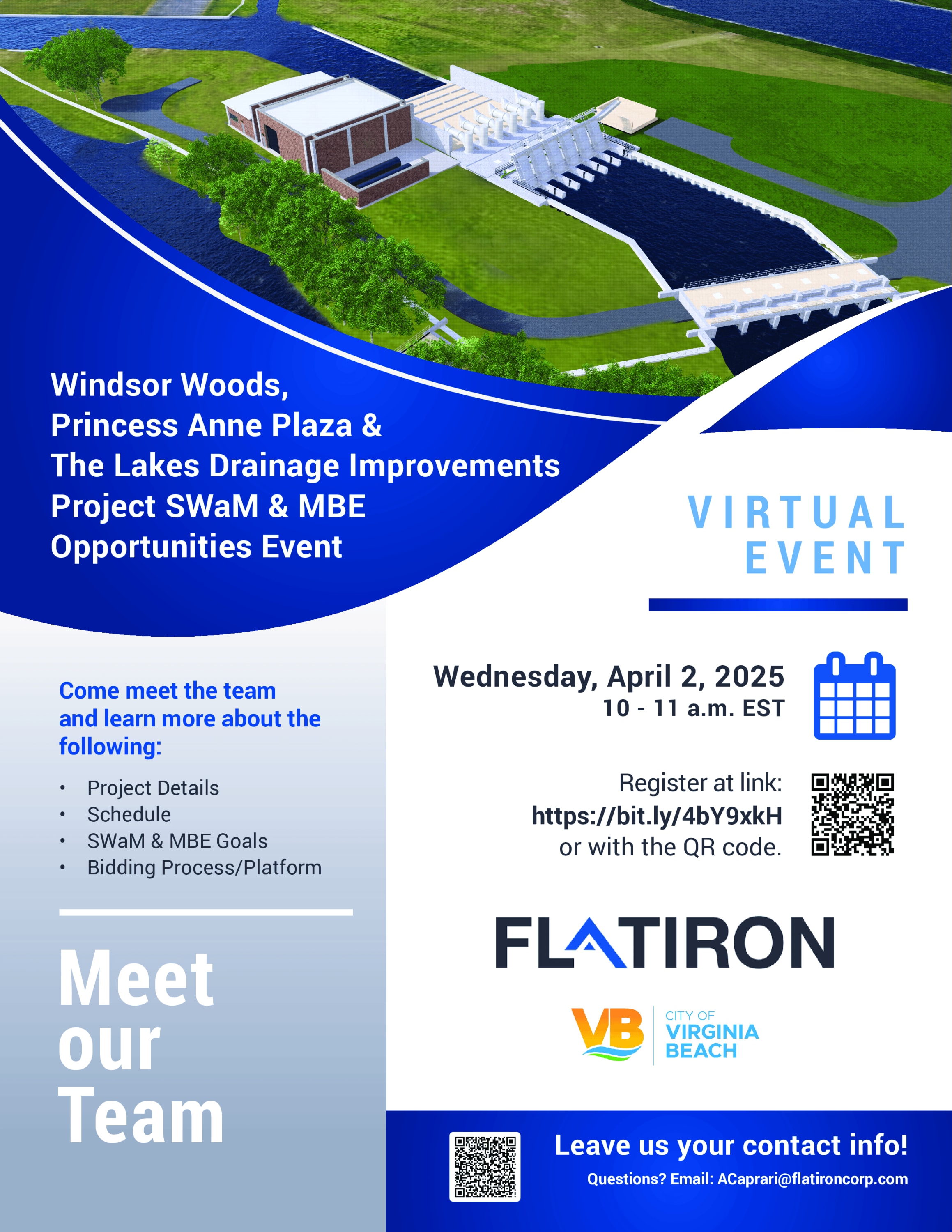 SWaM and MBE Informational Session for the Windsor Woods, Princess Anne Plaza & The Lakes Drainage Improvement Project. Come meet the team and learn more about the following: • Project Details • Schedule • SWaM & MBE Goals • Bidding Process/Platform Free Event