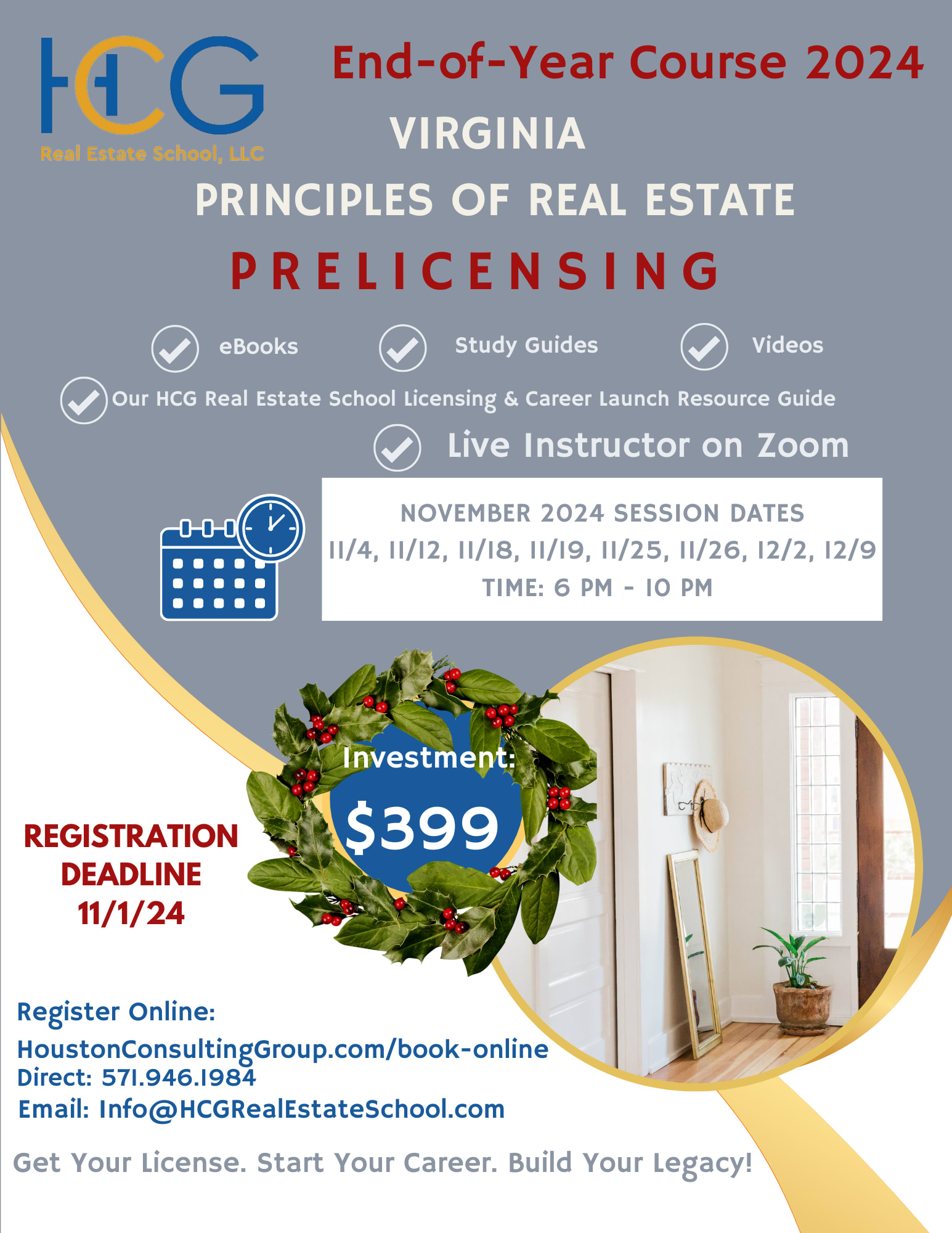 Registration is open for our End-of-Year Virginia Real Estate Pre-licensing Course starting November 4th! The first step in starting your career in real estate for Virginia is obtaining a license. Our 60-hour (32-hour seat-time hybrid) Principles of Real Estate Course will equip you with everything you need to obtain your Virginia Real Estate license and launch the real estate career of your dreams! Sessions will be taught with the convenient option to attend from anywhere you are virtually on Zoom with a live instructor. Fee includes eBooks embedded with study guides, videos, PLUS our HCG Real Estate Licensing & Career Launch Resource Guide to prepare you for the PSI exam! THIS COURSE FULFILLS THE 60-HOUR PRELICENSING COURSE REQUIREMENT. Deadline to register: November 1, 2024. Access the course schedule, details, registration and student reviews online at: November 2024 End-of Year Course Check out testimonials and career learning videos at: Testimonials and Learning Videos