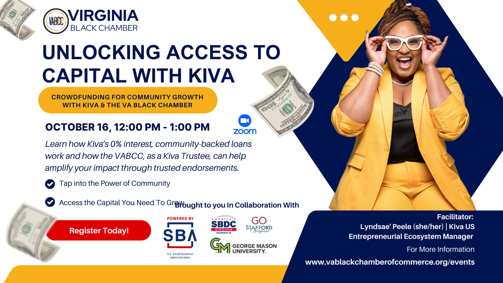 Join us for an engaging virtual session co-hosted by Kiva where we’ll explore how crowdfunding can empower small business owners and entrepreneurs to access the capital they need to grow. Learn how Kiva’s 0% interest community-backed loans up to $15,000 work and how the VABCC, as a Kiva Trustee, can help amplify your impact through trusted endorsements. Whether you're a business owner seeking funding or an ecosystem leader supporting entrepreneurs, this session will show you how to tap into the power of partnership and community to fuel business dreams—together. About the Virginia Black Chamber of Commerce The Virginia Black Chamber of Commerce (VABCC) is committed to building a sustainable business ecosystem that encourages growth, champions innovation, and facilitates opportunities for black businesses to thrive in Virginia. Through leadership, advocacy, and a commitment to serving our members, we dedicate ourselves to the progression of business development, believing that overall wealth can be enhanced through sustained collaboration and shared success. Learn more at www.vablackchamberofcommerce.org.
