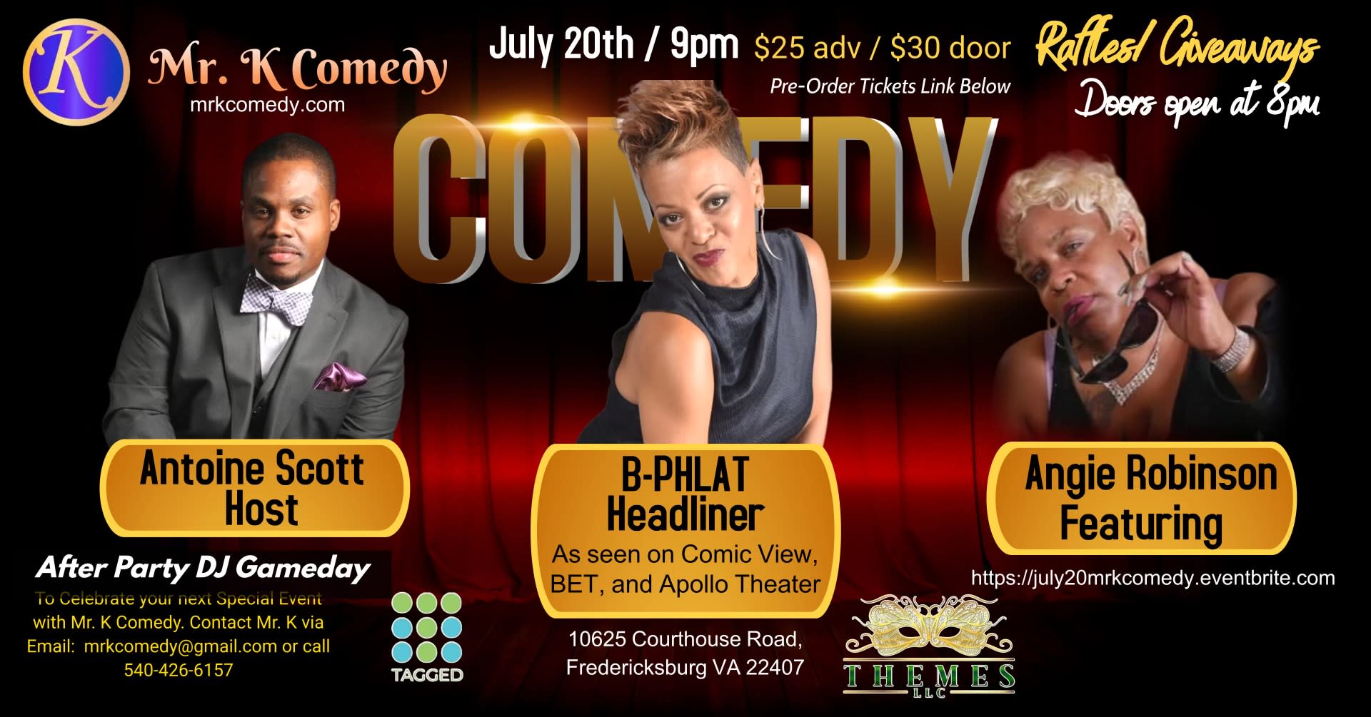 Another night of Grown & Sexy fun with the renowned comedian B-Phlat as seen of showtime at the Apollo, HBO and now live in Fredericksburg VA at THEMES Event Center. Tickets on sale at www.Mrkcomedy.com or pay a bit more at the door. Doors open at 8:00pm and show starts at 9:00pm.
