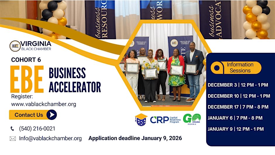 During this session, you'll gain a comprehensive understanding of our program structure and application process. JOIN OUR BUSINESS ACCELERATOR INFO SESSION! Take advantage of this opportunity to fast-track your business growth! If, due to extenuating circumstances, you are unable to attend an info session, please email info@vablackchamber.org. Application available at - www.vablackchamberofcommerce.org/ebe-accelerator-program