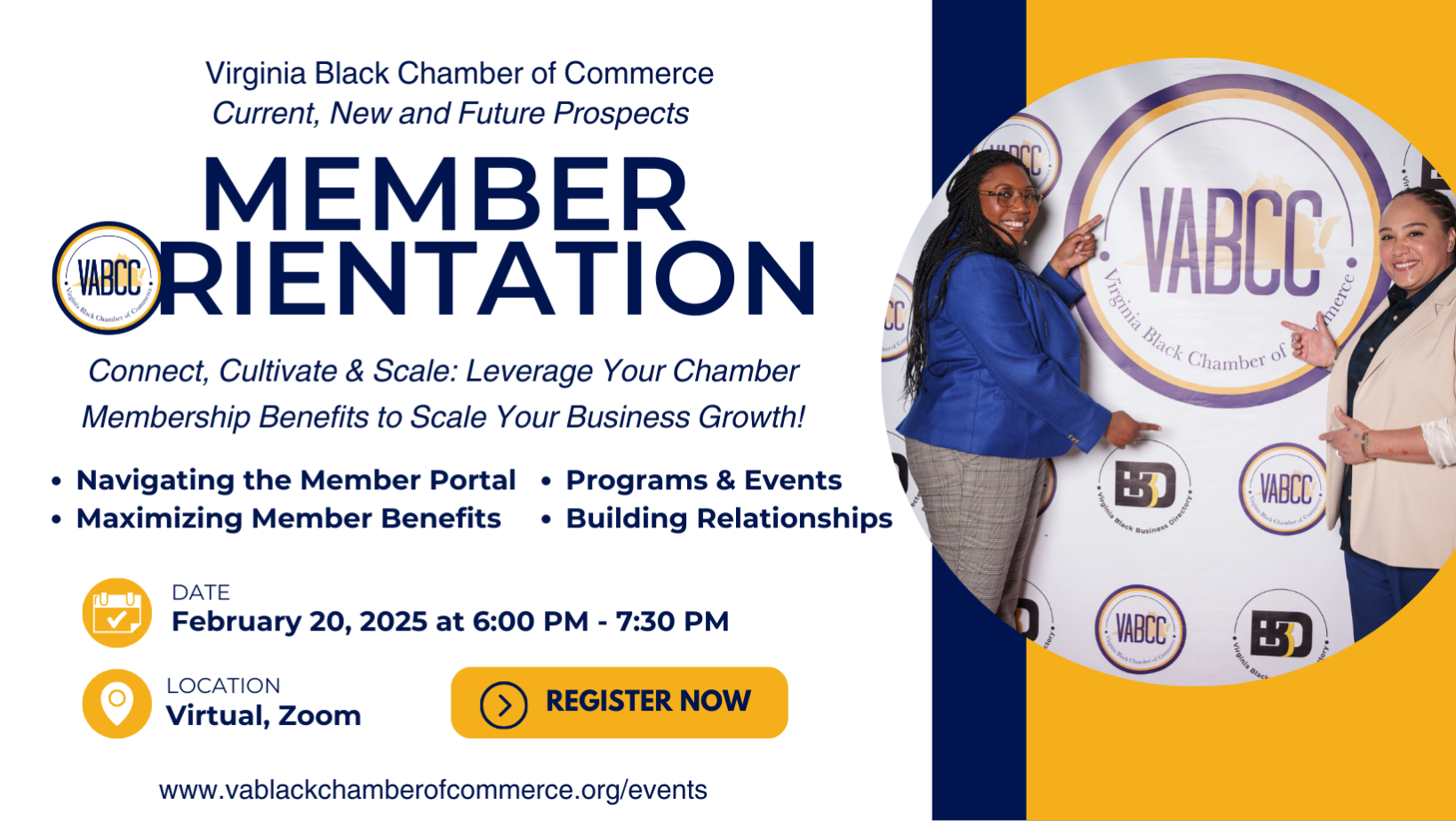 Member Orientation: Virginia Black Chamber of Commerce We're rolling out the red carpet to welcome you to the Member Orientation of the Virginia Black Chamber of Commerce! This is your golden ticket to an online event that promises to be a game-changer for all our members. Prepare to immerse yourself in a dynamic discussion packed with essential insights about maximizing your membership benefits, unlocking networking avenues, partaking in business education opportunities, and mastering the member portal navigation. But that's not all - you'll also discover how to make a difference as a chamber volunteer or ambassador, boost your business profit margin, and elevate your business's value proposition! Our seasoned team of experts will be on hand to answer any questions and help you navigate the world of entrepreneurship. This is a must-attend for members who are veterans of the business world and those just stepping onto the entrepreneurial ladder. This orientation isn't just an event - it's an opportunity to forge connections, gain knowledge, and supercharge your business journey. Mark your calendar and join us for an enlightening experience! Click here to register