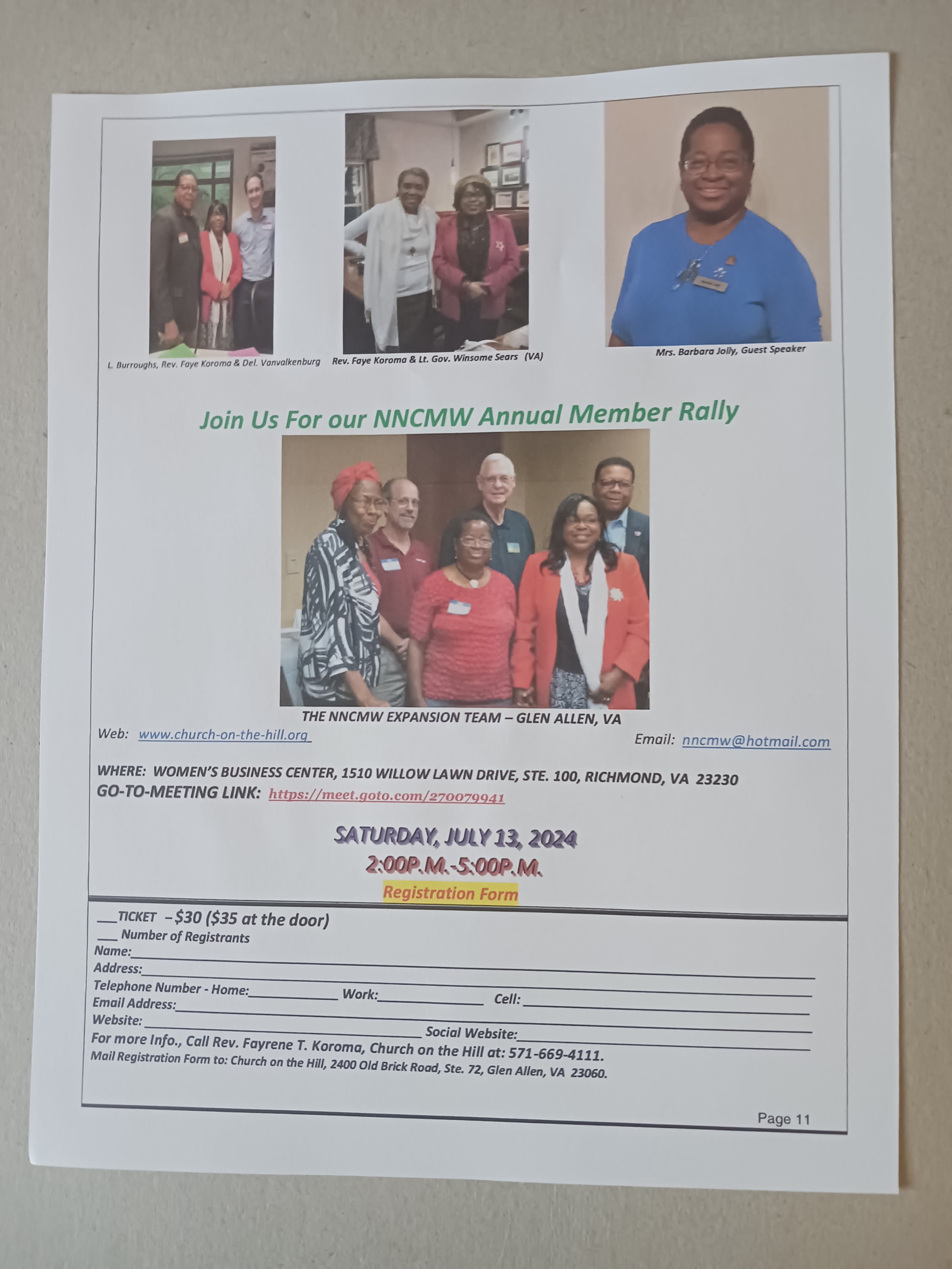 Remember to mark your calendar for the Saturday, July 13 from 2p.m. to 5p.m. NNCMW Annual Member Rally. We will meet at the Women's Business Center, 1510 Willow Lawn Drive, Ste. 100, Richmond, VA 23230! This is an "In-Person" and "Virtual" event. Ms. Barbara Jolly (Professional Organizer) is the Guest Speaker! THEME: "Getting it Straight." Please mark your calendar and plan to attend "In Person." We will be conducting Annual Elections to fill various NNCMW Committees. An official BALLOT will be provided upon your participation in this momentous event! There are 3 standing NNCMW Committees: 1. Membership 2. Special Events 3. Health Tickets are $30 ($35 at the door)! Refreshments Served. Here is the "Go-to-Meeting" LINK: https://meet.goto.com/270079941 For more info., send us an email at: nncmw@hotmail.com. Call the Church office at: 571-669-4111.