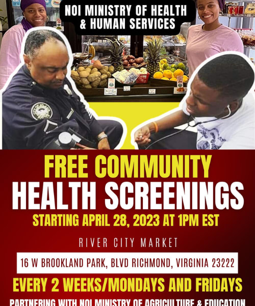 River City Market is proud to collaborate with Muhammad Mosque #24 Ministry of Health & Human Services to provide free community health screenings. Join us for a free screening and get your groceries in the same location! Haven't shopped at River City Market before? We're a neighborhood grocery store with organic locally grown fruits and vegetables, supplements, natural skincare products, and much more! Every 2 weeks on Mondays and Fridays: FREE, 100% free health screenings! Every 2 weeks on Mondays and Fridays starting April 28th