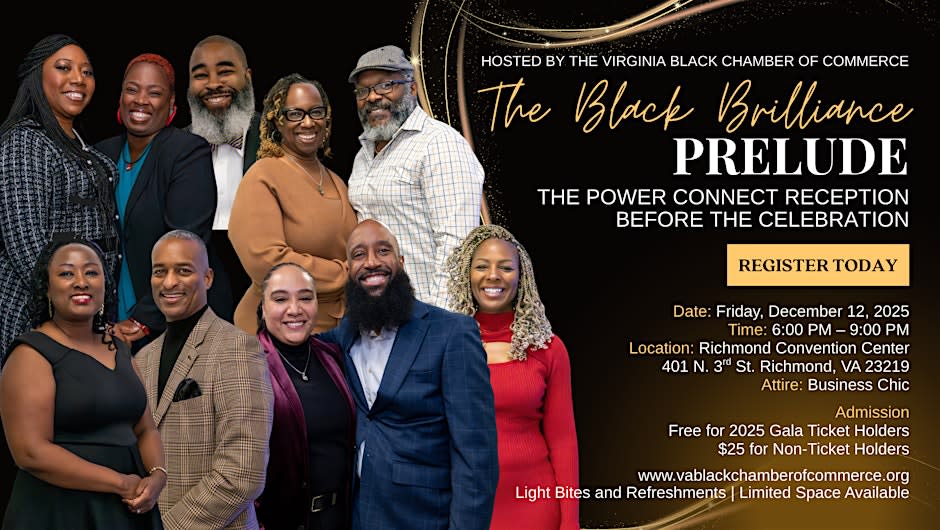 Enjoy a relaxed yet elegant atmosphere designed to foster meaningful connections among business leaders, entrepreneurs, and changemakers. Join us for The Power Connect Reception, which combines professional networking with celebration, featuring curated opportunities for connection, entertainment, and community storytelling that highlights leadership, innovation, and collaboration throughout which combines professional networking with celebration, featuring curated opportunities for connection, entertainment, and community storytelling that highlight leadership, innovation, and collaboration throughout, setting the stage for the 5th Annual Business & Community Leadership Gala. This exclusive evening combines professional networking with celebration, featuring curated opportunities for connection, entertainment, and community storytelling that highlight leadership, innovation, and collaboration across Virginia. Guests will enjoy a relaxed yet elegant atmosphere designed to foster meaningful connections among business leaders, entrepreneurs, and community changemakers. Light hors d'oeuvres, signature cocktails, and music will create the perfect backdrop for conversation and partnership-building ahead of the main Gala celebration. Who Should Attend: Business professionals, community leaders, entrepreneurs, corporate partners, and supporters of inclusive economic growth. Come ready to connect, collaborate, and celebrate the power of community before the big night!