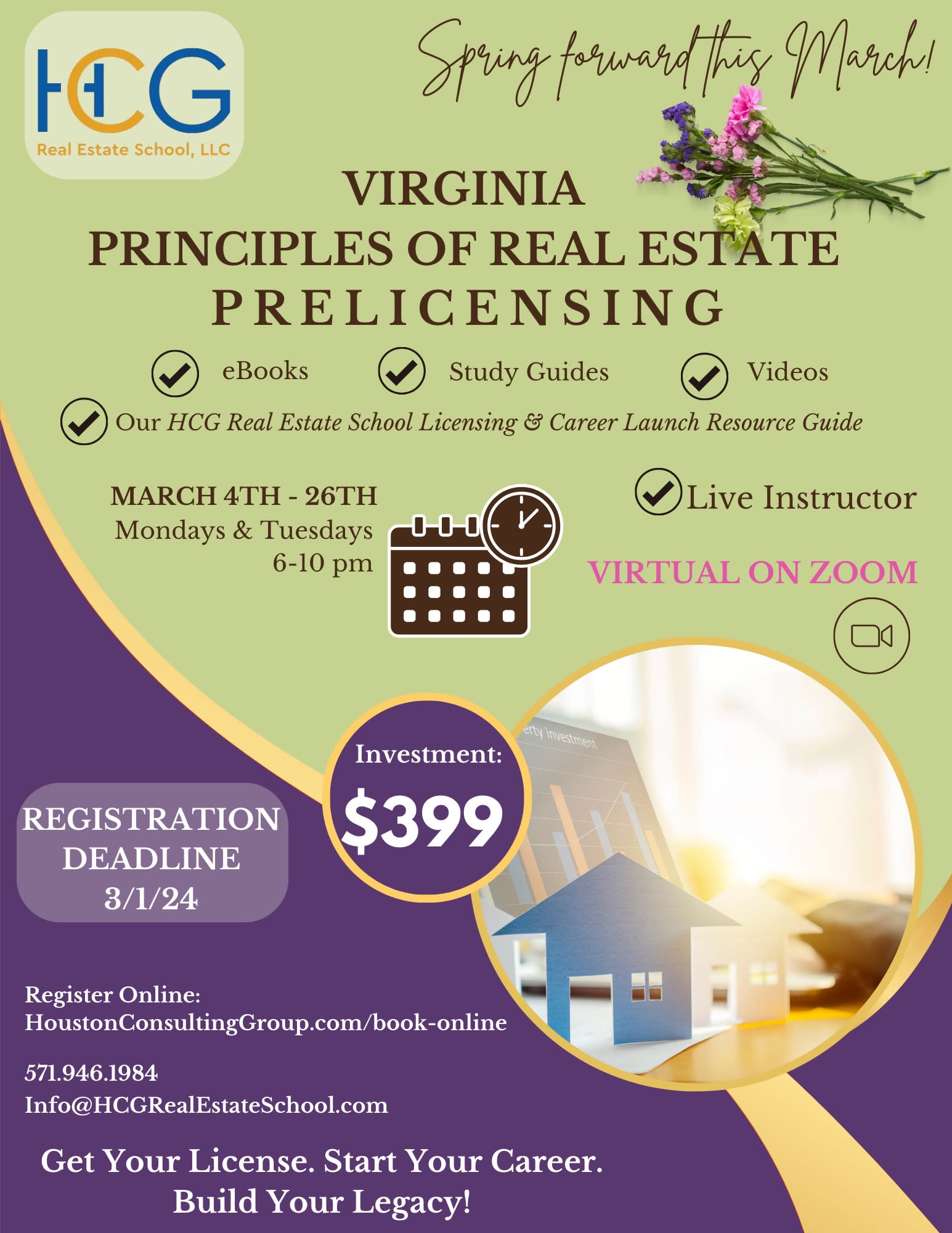 Spring forward this March! Registration is open for our next Virginia Real Estate Pre-licensing Course starting March 4th. The first step in starting your career in real estate for Virginia is obtaining a license. Our 60-hour (32-hour seat-time hybrid) Principles of Real Estate Course will equip you with everything you need to obtain your Virginia Real Estate license and launch the real estate career of your dreams! Sessions will be taught with the convenient option to attend from anywhere you are virtually on Zoom with a live instructor. Fee includes eBooks embedded with study guides, videos, PLUS our HCG Real Estate Licensing & Career Launch Resource Guide to prepare you for the PSI exam! THIS COURSE FULFILLS THE 60-HOUR PRELICENSING COURSE REQUIREMENT. Deadline to register: March 1, 2024. Access the course schedule, details, registration and student reviews online at: March 2024 Course